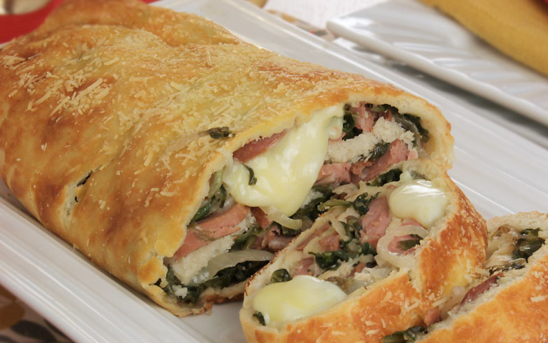 Pão Recheado de Quatro Queijos com Gorgonzola, parmesão, catupiry, mussarela, cebola, tomate, azeitona, salsinha e orégano
